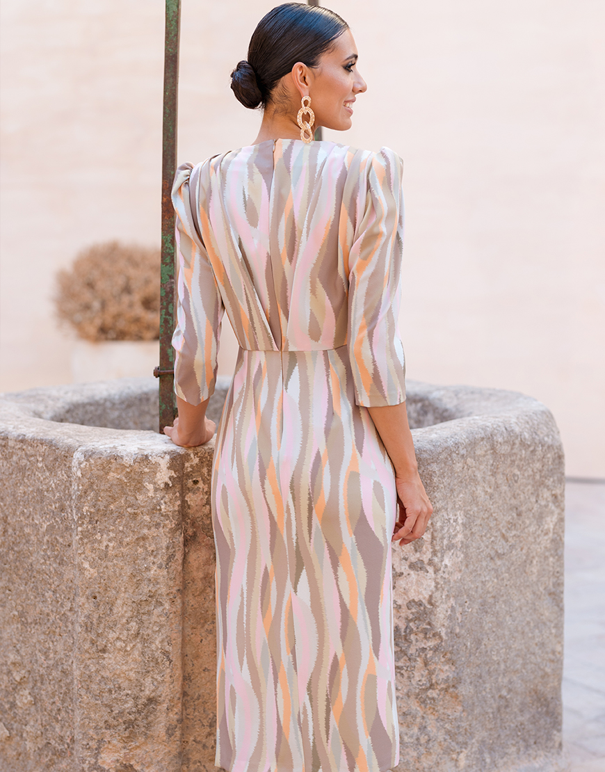 Vestido largo midi con escote en V y lazada . Los vestidos de Rosas Rosas están diseñados y confeccionados en España.